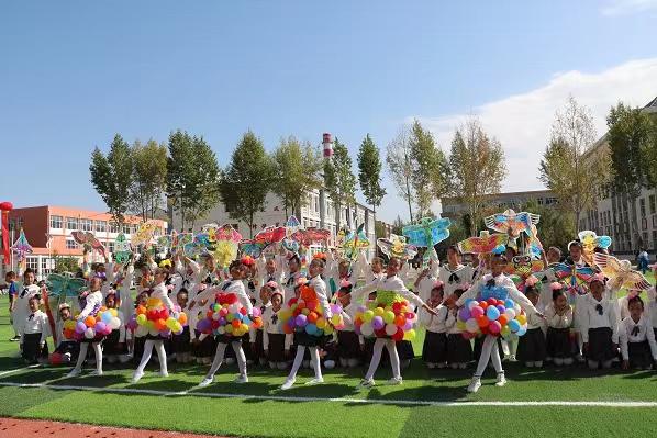 時(shí)代少年課間操,紅白相間是傘舞。紅鼓紅衣有腰鼓,手托蠟燭世間愛。韻律動(dòng)感曳步舞,“繩”彩飛揚(yáng)展陽光。綠茵場地黑白間,小小足球大夢想。氣球風(fēng)箏小飛機(jī),追逐夢想我先行。